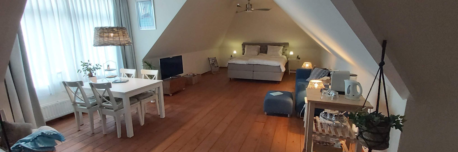 Ook deze kamer is ruim en volledig ingericht zodat je 's avonds kan genieten en uitrusten na een mooie dag buiten. Er zijn koffie- en theevoorzieningen en er staat een koelkastje tot je beschikking.